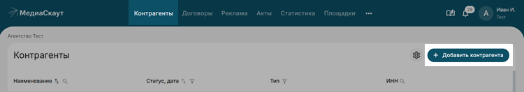 На вкладке Контрагенты нажимаем на кнопку Добавить контрагента: