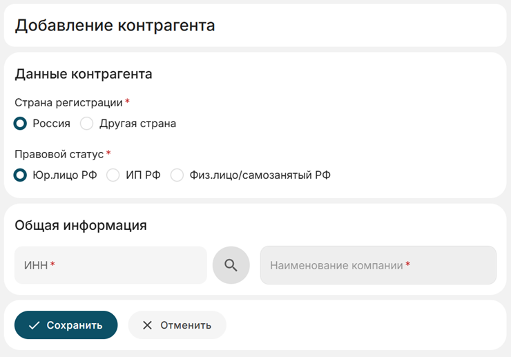 | Наименование | 1. В названии контрагента могут использоваться только буквы русского или латинского алфавитов, цифры и символы 2. Название контрагента не должно состоять только из одних символов 3. В начале и в конце не должно быть пробелов 6. Максимальная длина: 255 символов |