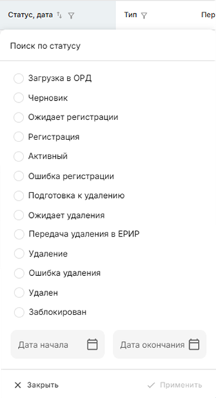 Ошибка удаления – после получения от ЕРИР ответа об ошибке после прохождения первого или второго этапа контроля. При возникновении данного статуса необходимо исправить ошибку. Пока сущность не перейдет в статус Удален – данные будут видны в ЕРИР.