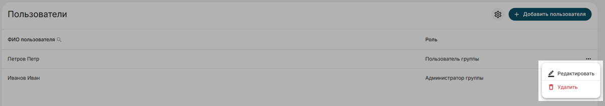 - Администратор группы - может работать со всем функционалом кабинета и редактировать других пользователей