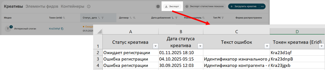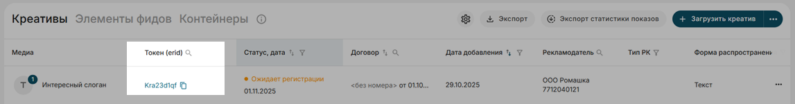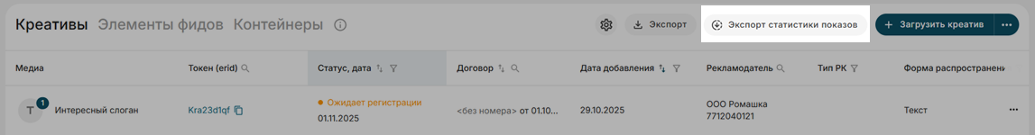 Выгрузка креативов и токенов (Erid)