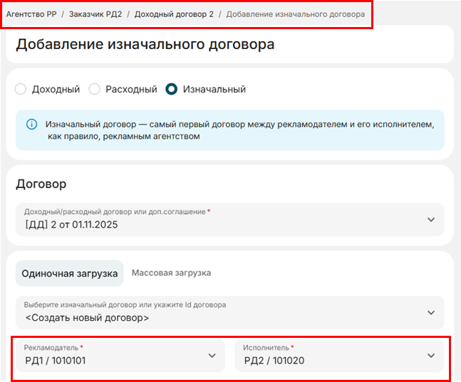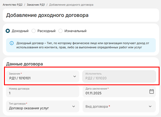 - Заказчик Рекламодатель 2 – Доходный договор с Рекламодателем 2 – Изначальный договор между Рекламодателем 2 и Рекламодателем 1