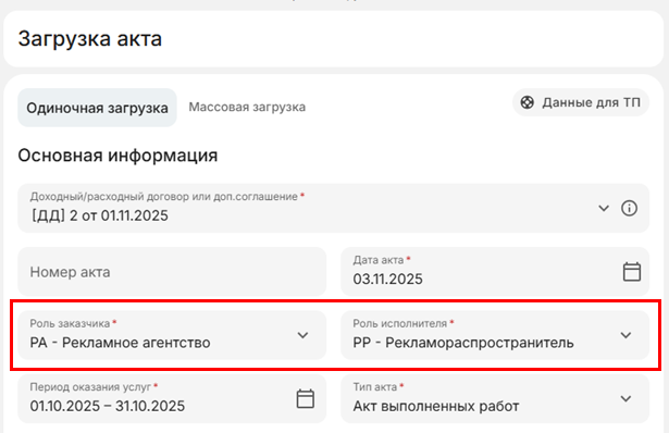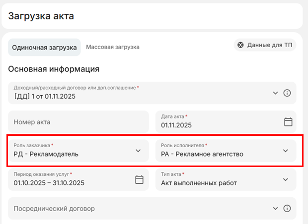 - Акт с Рекламодателем 2 – разаллокация акта по изначальному договору и доходному договору