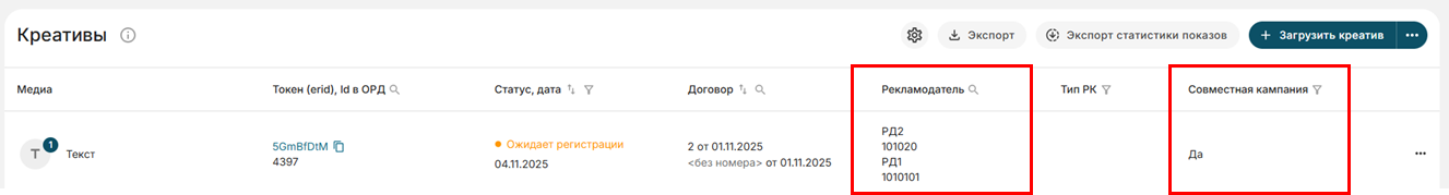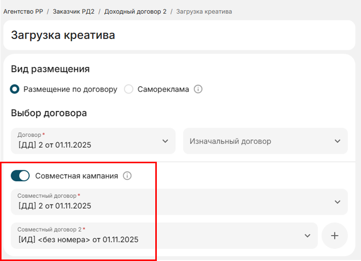 Создаем креатив с признаком «Совместная кампания» к изначальному договору и доходному договору: