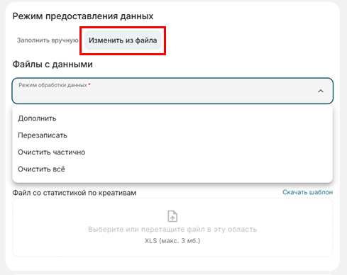 Режим Дополнить - в данном режиме возможно добавление новых договоров в разаллокации и новых строк статистики по связке erid +url площадки +Тип РК +месяц. При этом старые договоры и строки статистики останутся.