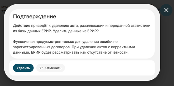 Функционал предусмотрен только для удаления ошибочно зарегистрированных актов. При удалении актов с корректными данными, ЕРИР будет рассматривать как отсутствие отчётности.