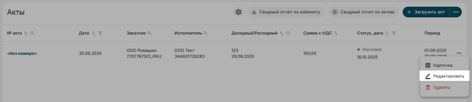 Для редактирование актов нажмите на Редактировать в правой части таблицы напротив нужного акта: