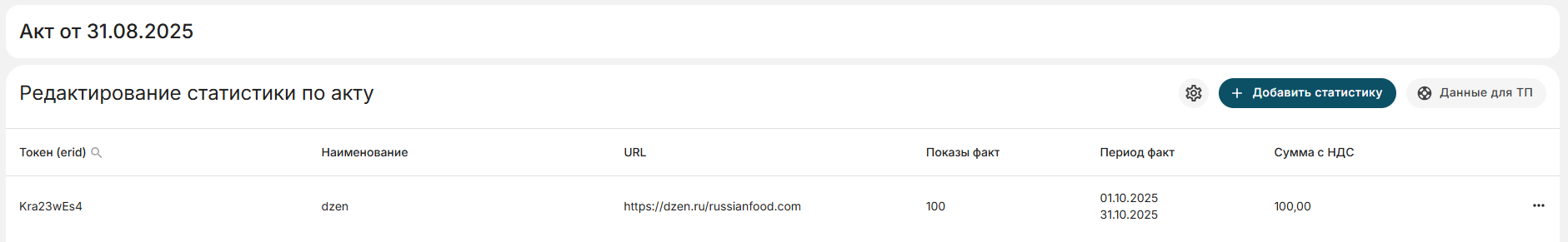 Если вы ранее передали к акту строку "erid + http://test.ru + CPM + 01.12.2023 - 10.12.2023 - 100 показов",