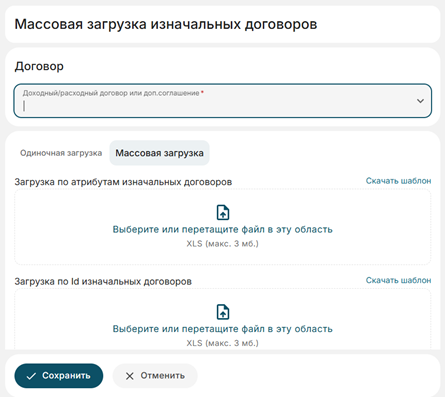 1 Путь. На вкладке Доходные договоры или Расходные договоры нажмите на договор или дополнительное соглашение, к которому нужно добавить изначальные договора. Далее нажмите кнопку Массовая загрузка. В данном случае поле "Доходный/расходный договор или доп. соглашение" уже будет заполнено: