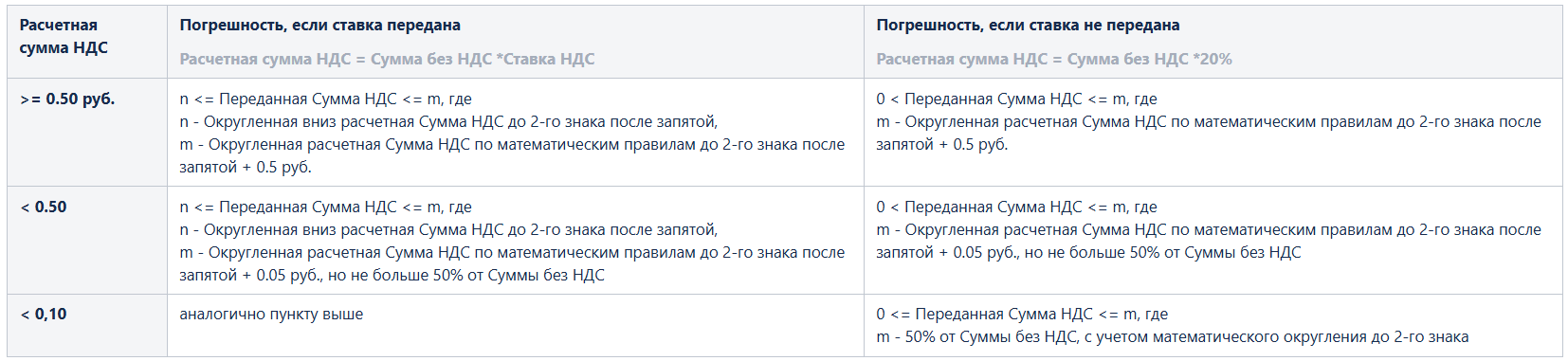 - больше или равное нулю и меньше произведения максимальной ставки НДС на Сумму без НДС с учетом погрешностей - если ставка не передана и расчетная Сумма НДС меньше или равна 0,10 руб, то сумма НДС должна быть равна нулю и меньше произведения максимальной ставки НДС на Сумму без НДС с учетом погрешностей